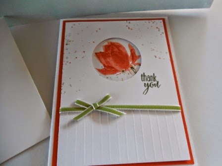 I made four of this card style and they featured mixed sayings - "Happy Birthday", "Thank You", "Get Better Soon" and "With Sympathy". I used Tangello Twist and Mossey Meadow Inks. |